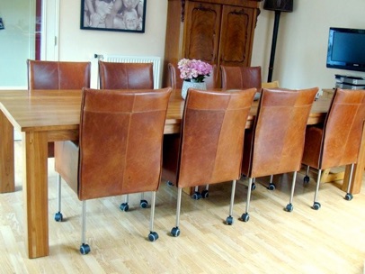 Wij leveren design lederen eetkamerstoelen, met of zonder armleuningen, met of zonder wieltjes, enorme keus uit vele leersoorten, geborsteld RVS fraai gevormde pootjes of zwart gemoffelde pootjes